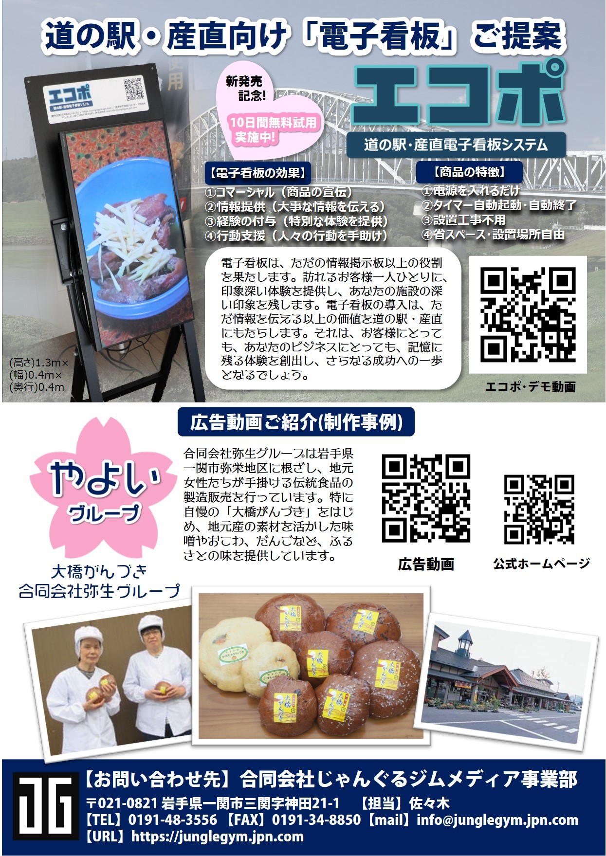 「エコポ」は、地元の魅力を最大限に引き出し、地域の活性化を促進するための最新の電子看板システムです。道の駅や産直市場を訪れる人々に、地域の情報や商品をリアルタイムで伝え、地元の生産者や事業者を支援します。